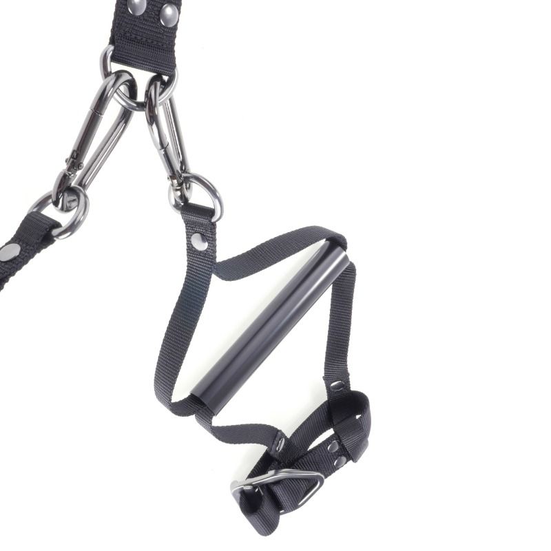 COMANDO. Feito para jogar duro. O conjunto de manguito de suspensão COMMAND cria uma sensação intensificada de exposição erótica. O design versátil protege os pulsos com firmeza por cima, presos com segurança pelo robusto parafuso de ancoragem incluído. O conjunto de manguito de suspensão envolve cada pulso individual com tiras de nylon grossas e duráveis de força industrial com anéis de bloqueio de aço inoxidável totalmente ajustáveis, permitindo um ajuste personalizado e controlado sempre. Cada manguito de suspensão possui uma barra de metal para suspensão com suporte.