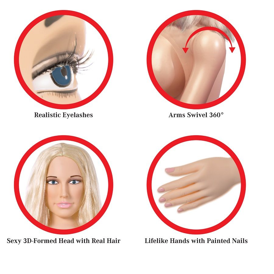 Esta incrível boneca do amor inflável em tamanho real foi meticulosamente projetada com recursos realistas para uma experiência verdadeiramente realista. Sua cabeça formada em 3D sexy apresenta cílios realistas e uma luxuosa cabeça de cabelo real que está implorando para ser puxado! Observe-a realmente ganhar vida com braços que giram 360 graus e unhas e dedos das mãos maravilhosamente pintadas. Dê um aperto em seus seios firmes e empinados enquanto desfruta de sua pele, buceta e bunda ultra realistas Fanta-Flesh que são ainda melhores do que a real! A buceta e a bunda Fanta-Flesh são removíveis para uma limpeza mais fácil e profunda e podem ser saboreadas separadamente para a masturbação. Uma bomba de inflação, kit de reparo de vinil e instruções estão convenientemente incluídos.