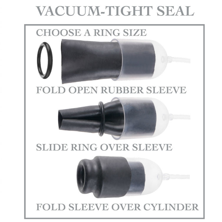 Desfrute de uma intensa simulação de sexo oral com a incrível Bomba de Cabeça Suck N’ Stroke. Este estimulador de ponta fácil de usar cria uma ação poderosa de sucção que estimula as terminações nervosas sensíveis por baixo e ao redor da cabeça do seu pénis. Com cada aperto da bola de bomba de estilo médico, a manga de borracha macia adere ao seu membro e desliza para cima e para baixo com cada bombada. Escolha primeiro o tamanho do anel, deslize o anel sobre a manga, dobre a manga sobre o cilindro da bomba e desfrute de um selo hermético a vácuo ao redor da sua cabeça. Certifique-se de usar bastante loção Moist® para um encontro extra molhado e selvagem!